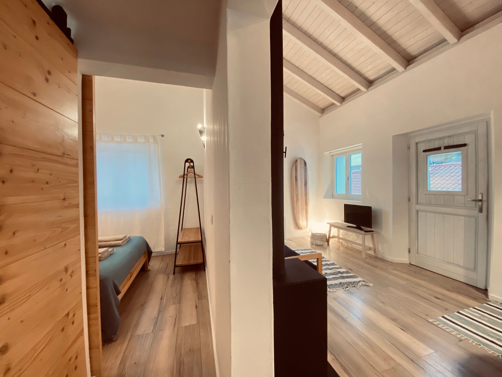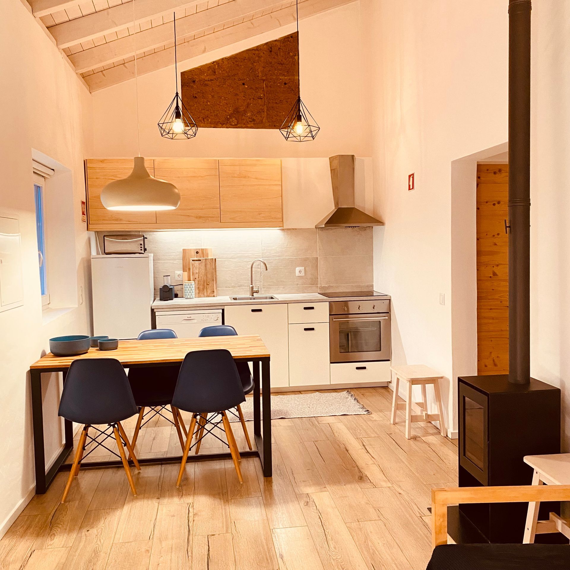 Casa com um quarto de casal, uma casa de banho com chuveiro e uma sala com cozinha completamente equipada. Espaço exterior com mesa e jardim. Ideal para duas pessoas, com a possibilidade de mais uma criança pois dispomos de cama de bebe extra.